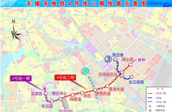无锡地铁4号线二期工程起自4号线一期工程博览中心站,沿震泽路、新华路敷设,止于锡士路站并预留延伸条件,路线全长约8.6公里。全线共设置车站6座,均为地下站。项目投资估算为64.12亿元,建设工期预计为48个月。